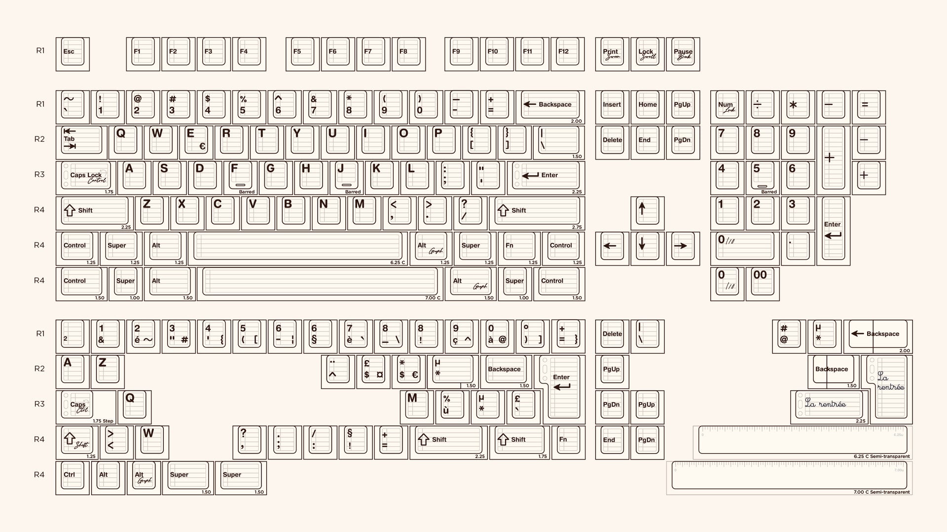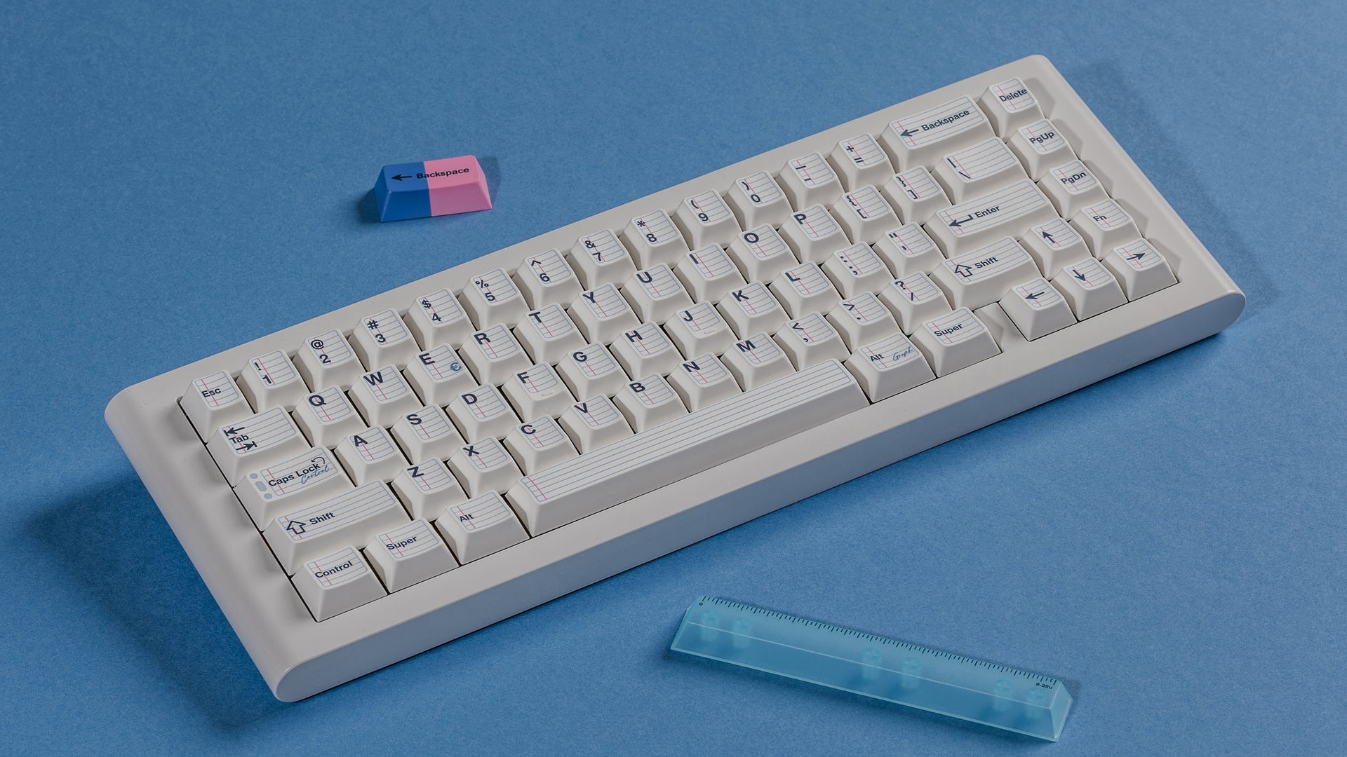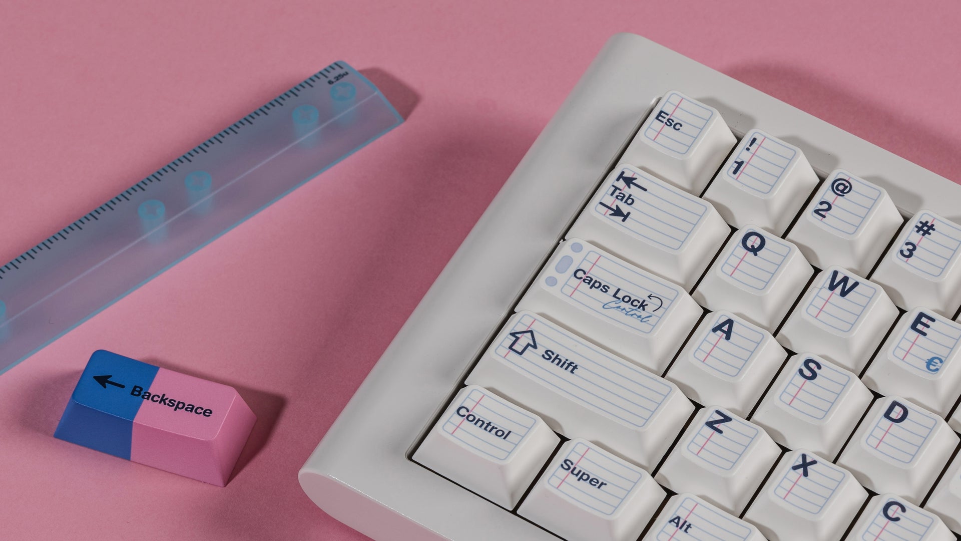 Cette capsule de keycaps inclut une superbe règle-touche espace pour prendre tes mesures et une gomme qui efface vraiment tes ratures.